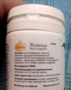 Как понятно по этикетке, собственно живицы тут маловато, последнее место в списке. Основное вещество – кедровое масло. Капсула из желатина, и добавлены стабилизаторы.
